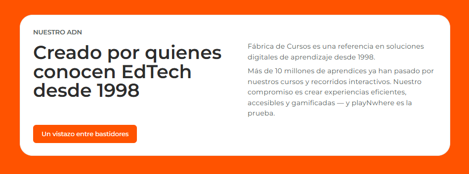¡Sí! playNwhere es el LXP gamificado con IA creado por Fábrica de Cursos, líder en e-learning corporativo desde 1998. Con él, puedes crear recorridos de aprendizaje impulsados por IA, juegos, rankings y mucho más — sin programar.